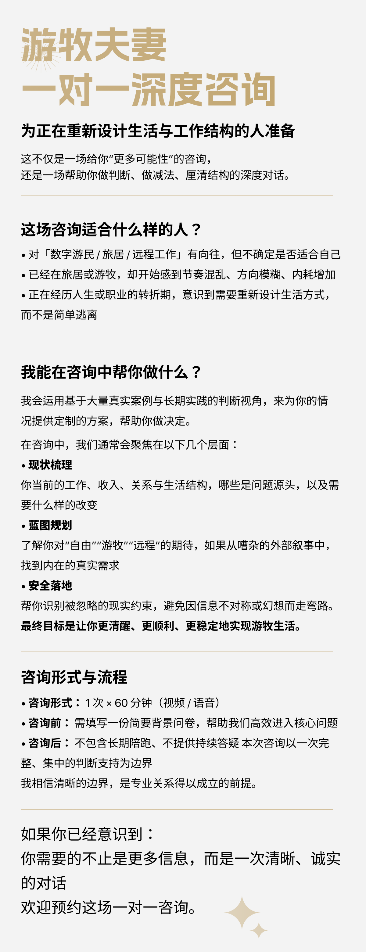 由游牧夫妻提供的一对一深度付费咨询服务,可根据你的具体情况定制旅居/职业路径,包括签证选择、远程工作机会、收入结构设计以及城市选择等。