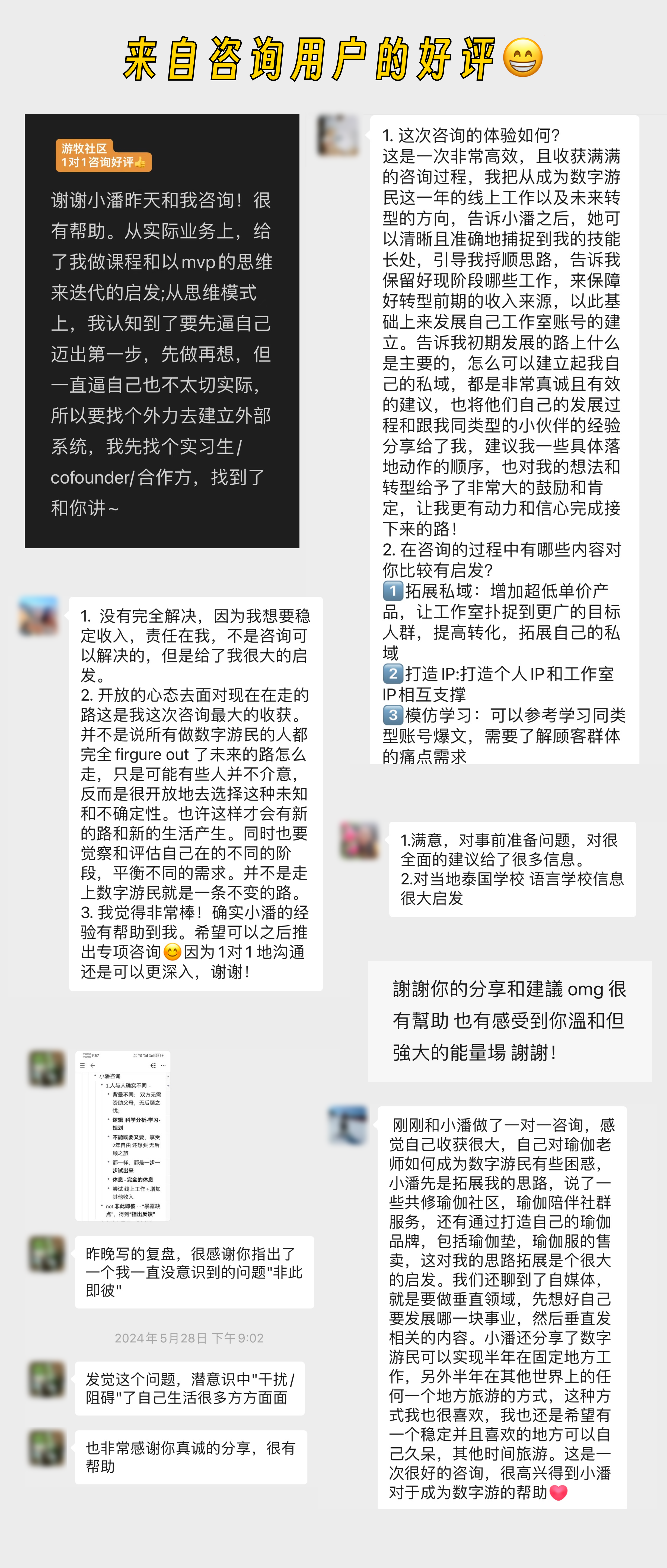 由游牧夫妻提供的一对一深度付费咨询服务,可根据你的具体情况定制旅居/职业路径,包括签证选择、远程工作机会、收入结构设计以及城市选择等。